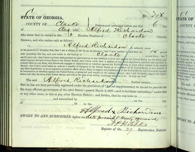 Alfred Richardson’s signature on voter registry. There are no known photographs of Richardson that have survived history.